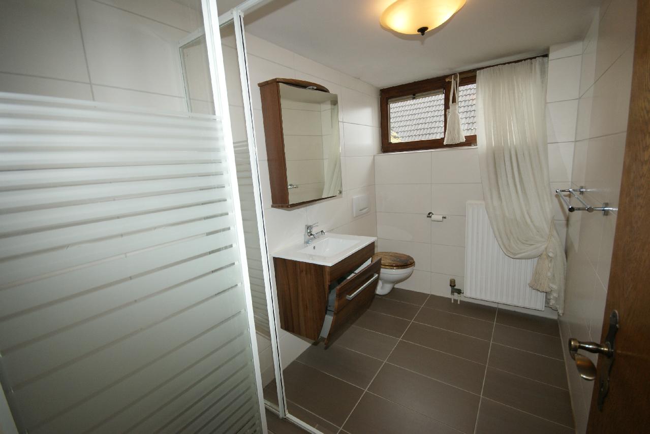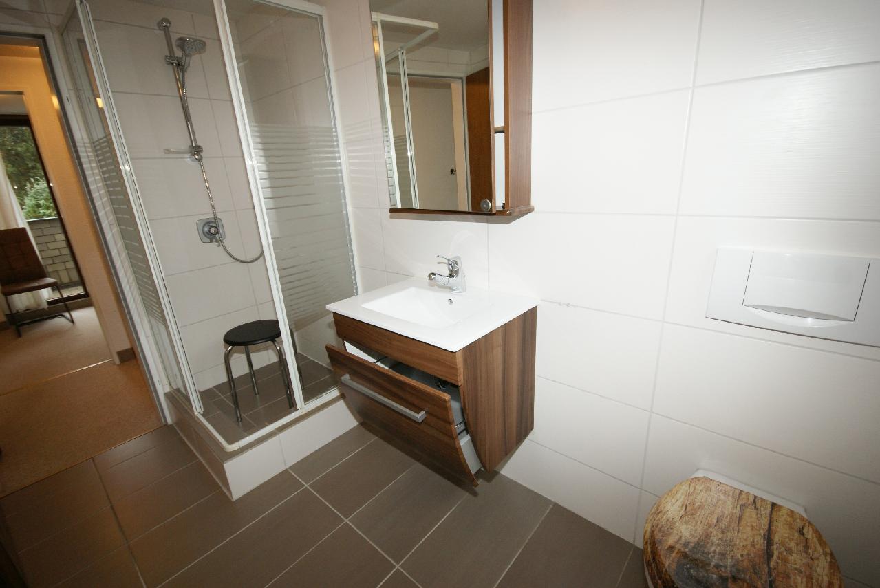 Das bereits sanierte, moderne Bad verfügt über eine Dusche, einen eingebauten Waschtisch mit Unterschrank sowie über ein WC. Das Bad verfügt auch über ein Fenster.
